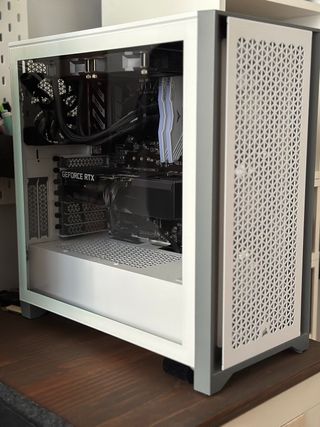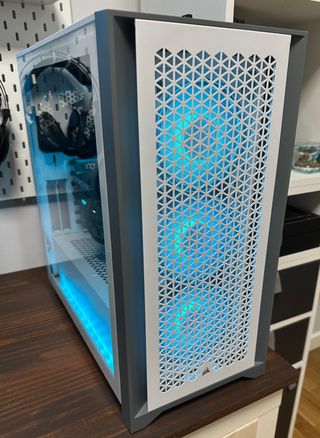 Potente ordenador gaming personalizado con procesador Ryzen 9 3950X. Gráfica RTX 2070 32 GB de RAM 512 GB de ssd M.2 + 2TB disco Refrigeración líquida Caja Corsair RGB. Diseño moderno en color blanco.
