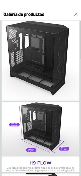 Caja de PC H9 FLOW con diseño espacioso y doble cámara. Cuenta con una esquina frontal en ángulo para una máxima refrigeración. - Dimensiones: 506 mm (alto) x 481 mm (ancho) x 315 mm (profundidad). - Tipo: ATX de torre media.