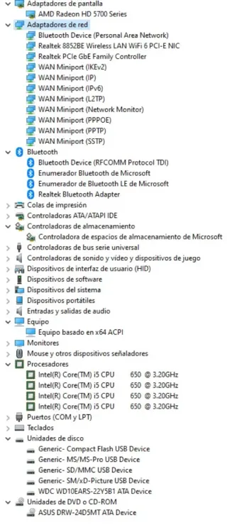 Ordenador con procesador Intel Core i5 y sistema operativo Windows 10 de 64 bits. Cuenta con unidad de DVD y disco duro de 1 TB. - Procesador: Intel(R) Core(TM) i5 CPU @ 3.20GHz (x4) - Almacenamiento: WDC WD10EARS-22Y5B1 ATA Device (1 TB) - Unidad óptica: ASUS DRW-24D5MT ATA Device - Conectividad: Realtek 8852BE Wireless LAN WiFi 6 PCI-E NIC, acabo de formatearlo y funciona bien, al iniciar he tenido que poner mi cuenta de google, habría que reinstalar y poner la de la persona que lo compre.
