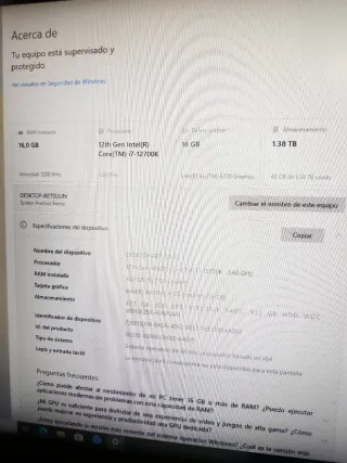 Pc gaming con i7 12700k de 12 núcleos/ 20 subprocesos, con frecuencia max 5.00 ghz, 25mb de caché, gráfica integrada UHD intel 770, compatible con ddr5, placa base Asus Prime h610m-e d4 lga 1700, 16 gb de ram g.skill tridentz RGB 3200 mhz, refrigeración líquida tempest argb 120, gráfica Asrock INTEL ARC A770 de 16gb, m.2 xpg SPECTRIX s40g 512gb RGB, disco duro western blue de 1tb, fuente de alimentación TACENS Mars mp800w, torre Tempest spook Atx RGB, Windows 10 pro activado.