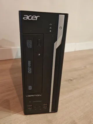 Ordenador de sobremesa Acer Veriton en color negro y plateado. Diseñado para un uso eficiente. -Cpu AMD de 2 núcleos - Memoria RAM: 8GB DDR4 Ballistic de La marca Crucial - Almacenamiento: 500GB HDD - Dos salidas de displayport y una salida DVI