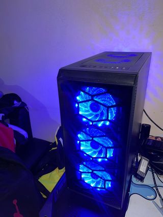 Ordenador de sobremesa con un llamativo ventilador RGB. - Puertos USB y conexiones de audio en la parte trasera. - Ventilador con iluminación púrpura. - Diseño moderno PRECIO NEGOCIABLE Lo vendo a ese precio por no tiene casi ni un año No se cuanto pesa