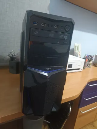 Torre de ordenador con un diseño moderno y llamativo. - Panel frontal con detalles en azul. - Puertos USB frontales para fácil acceso. - Bahía para unidad óptica. - Contiene procesador i5 8600k con graficos - Placa Gigabyte B360M DS3 H - 16gb de memoria DDR4 (2x8) a 2133 - ssd 128gb - Grafica Sapphire RX 570 4gb - Regrabadora de DVD Un puerto USB de la placa no funciona y no tiene chapa trasera. - Se entrega con Windows11 y Office 2024 activados