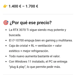 Potente PC gamer con Windows 11 Pro y procesador i7. Se entrega , con el pack Office y codo configurado para su buen rendimiento . Pantalla en la torre de 7" para controlar la temperatura interna. Con fondo editable . - Tarjeta gráfica NVIDIA GeForce RTX 3070 Ti - Diseño con iluminación RGB. - Múltiples ventiladores para óptima refrigeración. Con luces -Refrigeración liquida , para el procesador, con luces -Ram de 32 gb -Discuro duro de 500GB Precio de mercado entre 1400€ y 1700€ Todos los componentes nuevos con factura