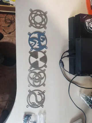Envío por Inpost Conjunto de cinco protectores metálicos para ventiladores de PC, ideales para personalizar tu equipo. Se regala la ultima foto recambio sin usar más tornillería - Diseño de geometría compleja. - Diseño de dragón estilizado. - Diseño de aspas. - Símbolo de riesgo biológico. - Diseño de dragón oriental.