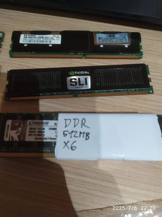 Diferentes memorias RAM para sobremesa y server/ECC *Sobremesa 1 modulo PC100 (desconozco capacidad)(Apple) 16 modulos 128mb PC133 8 modulos 256mb PC133 2 modulos 512mb PC133 2 modulos 128mb DDR 1 modulo 256mb DDR 6 modulos 512mb DDR 2 modulos 215mb DDR2 2 modulos 2GB 6400 (OCZ con disipador NVIDIA SLI) DDR2 2 modulos 1GB 5300F ECC Samsung/ELPIDA DDR2 5 modulos 4GB 5300P ECC Micron DDR2 3 modulos 4GB 12800u Hynix DDR3 7 modulos 8GB Hynix/Samsung DDR3 6 modulos 8GB 14900R ECC CISCO server Hynix DDR3 2 modulos 8GB DDR4 2400T Ramaxel Tengo más ram en mi perfil de tipo de ram mas antigua. Pregunta precio