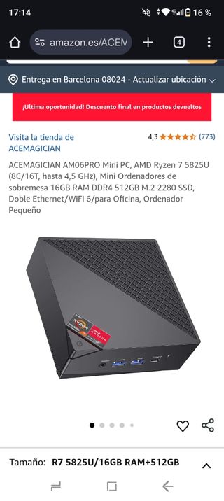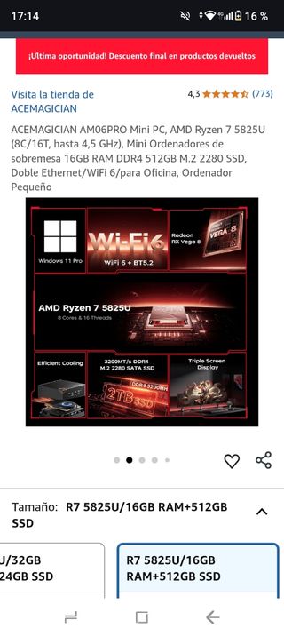 ACEMAGICIAN AM06PRO, en perfecto estado. - Procesador AMD Ryzen 7 5825U (8C/16T, hasta 4,5 GHz) - 16GB de RAM DDR4 - SSD M.2 2280 de 512GB - Doble Ethernet y WiFi 6 Perfecto para edición de vídeo en CAPCUT,FILMORA Y USO EN IA, LO HE USADO PARA JUGAR EN: FORZA 4 GRÁFICOS EN ULTRA BIEN PERO CON ALGO DE LAG SI JUEGAS EN MEDIO VA PERFECTO, VALORANT SEGURAMENTE SOLO QUE NUNCA LO HE PROBADO, LO VENDO PORQUE YA NO LO USO CASI NADA Y PREFIERO VENDERLO, HE ECHO FOTOS DE DONDE LO COMPRE EN AMAZON, no hago fotos del mini PC ya que aún lo uso para algo, AHORA ESTA A MENOS PRECIO YO LO VENDO A 250€ y no bajo más de 250€, ESTA PERFECTO ESTADO.