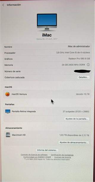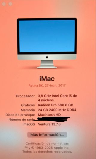 Ordenador iMac de 27 pulgadas, modelo Retina 5K de 2017. Este equipo cuenta con una configuración potente para un rendimiento fluido. - Procesador: 3,8 GHz Intel Core i5 de 4 núcleos - Gráficos: Radeon Pro 580 8 GB - Memoria RAM: 24 GB DDR4 a 2400 MHz - Pantalla Retina integrada de 27 pulgadas (5120 x 2880) - Almacenamiento: Macintosh HD con 2,12 TB - Sistema Operativo: macOS Ventura (Versión 13.7.8) NO ACEPTO REGATEOS.