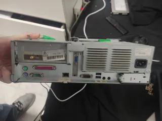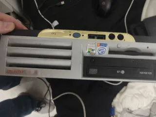 Ordenador de sobremesa Compaq Evo. Sin disco duro, pero si funciona , creo que es un pentium 4 - Carcasa plateada con detalles dorados. - Frontal con rejilla de ventilación y bahías para unidades. - Puertos USB frontales.