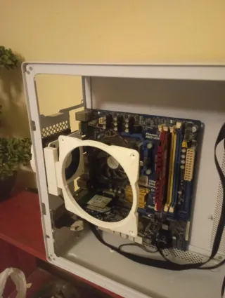 Torre de ordenador de sobremesa en color gris plata, en buen estado. Ideal para usar sus componentes. - Incluye caja, placa base y ventilador. - Se entrega tal cual se ve en las fotos.