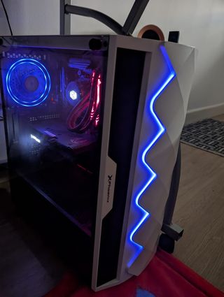 Se vende ordenador gaming completo con iluminación RGB. - Torre negra con ventiladores frontales iluminados. - Iluminación interior personalizable. - Incluye ratón, teclado, pantalla y los altavoces de las fotos Componentes Placa Base X79 Machinist Xeon E5 2650V2 16Gb RAM DDR4 NVIDIA GTX 1650 4gb 500GB SSD