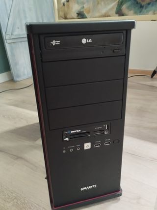 Caja para ordenador de sobremesa en color negro. - Diseño frontal con varias bahías. - Puertos frontales para USB y audio. - Lector de tarjetas integrado. - Unidad óptica LG Super Multi. -Con placa base y fuente de alimentacion. Son viejas pero funcionan. Con grabadora cd