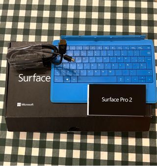 Ordenador Microsoft Surface Pro 2 en color negro, con teclado azul, cable HDMI y tarjeta micro SD. Incluye: - Caja original - Cargador original - Teclado Microsoft Type Cover Cyan/Azul - Cable HDMI - Mini display port - Tarjeta micro SD 64GB tipo 10, marca Verbatim Especificaciones técnicas: - Procesador intel core i5 - Disco 128GB + 64GB SD - Memoria RAM 4GB - Windows 10 Pro Usado, en buen estado, sin arañazos en la pantalla ni el teclado. Solo presenta un ligero desgaste en los exteriores del ordenador y del teclado.