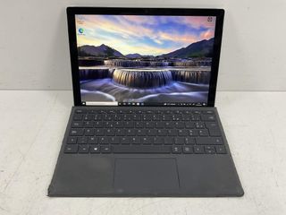Tablet Microsoft Surface Pro 4 en color plata. - Modelo del sistema: Surface Pro 4 - Tipo de sistema: PC basado en x64 - Procesador: Intel(R) Core(TM) i5-6300U CPU - Modo de BIOS: UEFI - Rol de plataforma: Tableta táctil. El táctil por la parte de arriba no va no se por qué Biene con teclado Funciona bien pero lo vendo para piezas no reclamaciónes