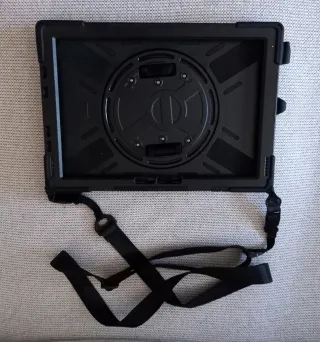 Funda protectora negra para Surface, diseñada para facilitar su transporte. - Material resistente. - Correa ajustable para colgar. - Diseño con soporte giratorio. Solo usada una o dos veces porque ya no tengo el ordenador. Comprada en Amazon. No tiene marca.