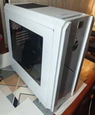 Caja de ordenador tipo torre con un diseño moderno y elegante. - Panel lateral con ventana. - Acabado en color blanco. - En excelente estado sin marcas ni roces, con dos ventiladores - Funciona perfectamente