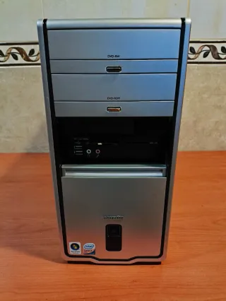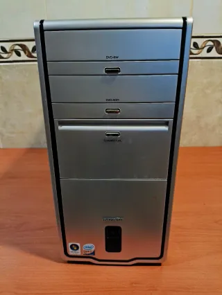 Torre de ordenador de sobremesa con un diseño clásico en color negro y plateado. Cuenta con una unidad óptica y ranuras frontales para tarjetas. - Unidad óptica M-DISC LG. - Lector de tarjetas frontal. - Puertos USB frontales. Características: AMD athlon 64x2 2.60ghz 4gb de RAM ddr2 250gb de disco duro Windows 10 pro lite La torre funciona perfectamente algo lenta. la vendo para repuesto piezas No negociable