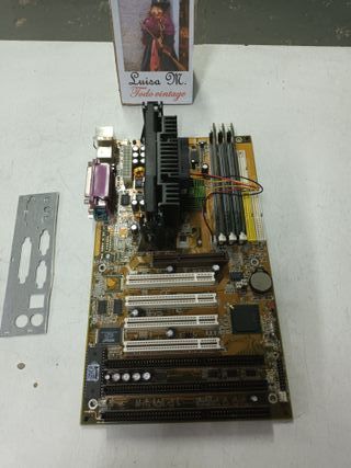 Placa base SOYO SY-6BA+ TIENE UN PROCESADOR PENTIUM 350MHZ, funcionando tal como se ve en las fotos, ( la placa ha sido desmontada de un pc y conectada a corriente y comprobada que enciende y da video, no esta reparada ni se le ha revisado nada mas, solamente lo que se se ve en las fotos) VENDO LA PLACA, EL PROCESADOR, EL DISIPADOR, LA MEMORIA RAM QUE TIENE PUESTA, ref. n-10 producto vintage sin garantia ni devolucion