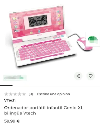 Ordenador infantil VTech en tonos rosa y blanco. Ideal para el aprendizaje. - Pantalla con diseño. - Teclado QWERTY. - Incluye ratón. - Divertidos juegos y actividades. Lo pidió a Papá Noel y no era lo que ella esperaba. Para que quede por ahí acumulando polvo, prefiero que alguien lo use. Costó 60€, tengo el ticket