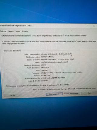 Ordenador de sobremesa Lenovo M700 con procesador Intel Core i7. - - Memoria RAM: 8192MB - Procesador: Intel(R) Core(TM) i7-6700T CPU @ 2.80GHz (8 CPUs), ~2.8GHz - Sistema operativo: Windows 10 Pro 64 bits - Versión de DirectX: DirectX 12 -Disco duro 50GB -No incluye cable de alimentación