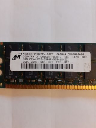 2 módulos de memoria de 2GB cada uno marca Micron + 2 de 512MB Micron. 5GB en total. 2Rx4 PC2 DDR2 5300P ECC registrada a 667 Mhz . En perfecto estado y como nuevas. Es memoria de servidor. IMPORTANTE !!! Sólo válida para procesadores Intel Xeon. No valida para procesadores Intel i3,i5 e i7.Ideal para placas que la soporten. Ver mi perfil y opiniones. Workstation o Gaming. HP Z, LENOVO, MEMORIA DDR2 ECC, XEON