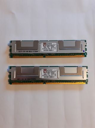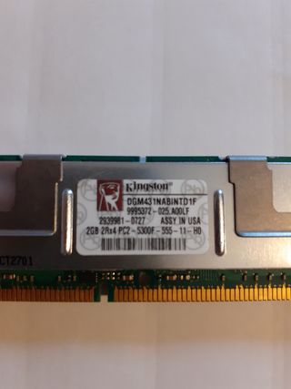 2 módulos de memoria de 2GB cada uno marca Kingston DGM431NABINTD1F + 2 de 512MB Hynix. 5GB en total. 2Rx4 PC2 DDR2 5300F ECC a 667 Mhz . En perfecto estado y como nuevas. Es memoria de servidor. IMPORTANTE !!! Sólo válida para procesadores Intel Xeon. No valida para procesadores Intel i3,i5 e i7.Ideal para placas que la soporten. Ver mi perfil y opiniones. Workstation o Gaming. HP Z, LENOVO, MEMORIA DDR2 ECC, XEON
