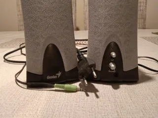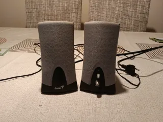 Altavoces Genius para PC con un diseño moderno. - Acabado en tela gris y base negra. - Controles de volumen y encendido en la parte frontal. - Logo de Genius en la base.