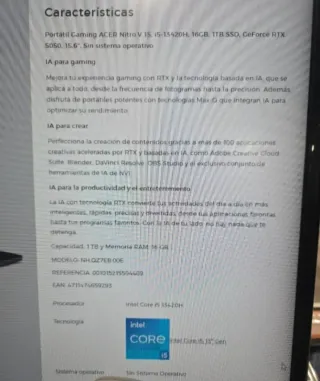 Portátil Acer Nitro 5 con un diseño llamativo. - Acabado en negro y multicolor. - Presenta un diseño gráfico distintivo en la tapa. Portátil Acer Nitro 5 en color negro, modelo AN515-46-R96V. - Procesador AMD Ryzen™ 7 6800H. - Pantalla LCD de 15.6 FHD IPS 144Hz Slim Bezel. - Gráficos NVIDIA® GeForce RTX™ 3050 con 4 GB GDDR6. - Memoria RAM de 16 GB DDR5. - Almacenamiento SSD PCIe NVMe de 512 GB. - Conectividad WiFi 6E + Bluetooth. Se vende nuevo con su caja, en PC Componentes se vende en 1155 te ahorras casi 450€ Perfecto para gamer, estudios, etc