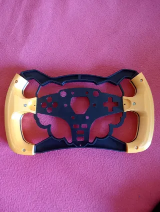 Volante Moza estilo F1 con acabado en fibra de carbono y detalles naranjas. - Diseño inspirado en la Fórmula 1. - Placa frontal con patrón de fibra de carbono. - Empuñaduras de color naranja. - Múltiples botones y diales en la parte frontal.