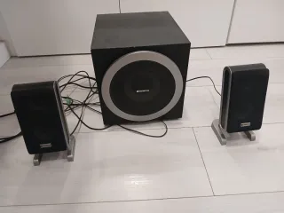 Sistema de sonido para ordenador. - Subwoofer negro con frontal plateado. - Dos altavoces satélite negros con soportes plateados.