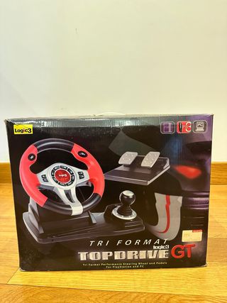 Volante de conducción Tri Format Top Drive GT de Logic3. - Incluye volante y pedales. - Compatible con PlayStation y PC. Precio original: 40€