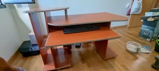 Práctico escritorio para ordenador con bandeja extraíble para teclado. - Diseño moderno y funcional. - Superficie de madera resistente. - Bandeja deslizante para teclado. En muy buen estado