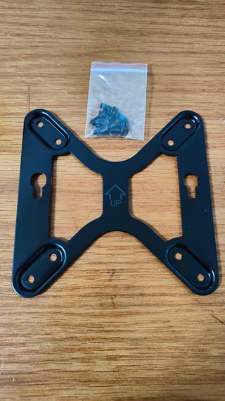 Soporte metálico negro para Mini PC con indicación de orientación. - Diseño en forma de X. - Incluye bolsa con tornillos.