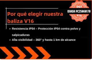 Baliza de señalización V16 con certificación IDIADA PC25060170. Diseñada para ser vista fácilmente. - Homologada según normativa. - Conexión magnética para fácil instalación. - Visibilidad 360º a 1 km. - Protección IP54 contra agua y polvo. - Cobertura nacional. - Tecnología IoT para conectividad. puedes consultar en la web de la DGT su homologación introduciendo su certificación (IDIADA PC25060170)