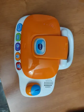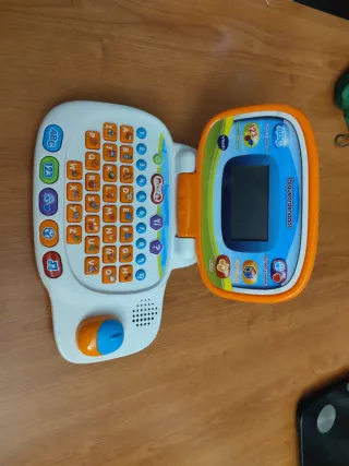 Pequeño ordenador educativo de Vtech con diseño infantil. - Botones con diferentes funciones: ABC, 123, música, etc. - Pantalla con marco azul. - Asa para facilitar su transporte.