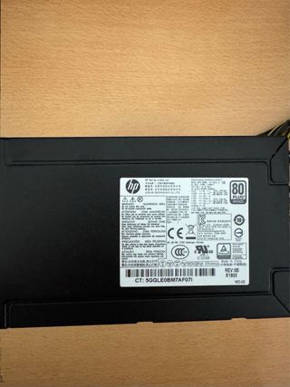 Fuente de alimentación HP de 500W. Incluye cable de alimentación. Tiene unos años de uso pero funciona bien. He comprado un nuevo PC y estoy vendiendo las piezas funcionales y en buen estado del que tenía anteriormente (solo me queda esta). Modelo 80 PLUS BRONZE. Certificación: CE, CCC, UL, RoHS.