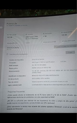 Ordenador de sobremesa con buenas especificaciones para uso general y gaming ligero. - Procesador: AMD Ryzen 5 1600 Six-Core Processor (3.20 GHz) - Memoria RAM: 16.0 GB (7.93 GB usable) - Tarjeta Gráfica: NVIDIA GeForce GT 1030 (2 GB) - Almacenamiento: 112 GB SSD Samsung SSD 850 EVO + 447 GB SSD KINGSTON SA400 - Sistema Operativo: Windows 64 bits