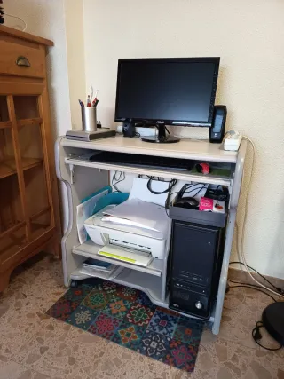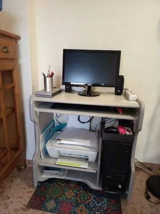 Mueble de ordenador con un diseño funcional y moderno. - Estructura principal en madera. - Detalles y componentes en plástico. - Amplio espacio de almacenamiento.