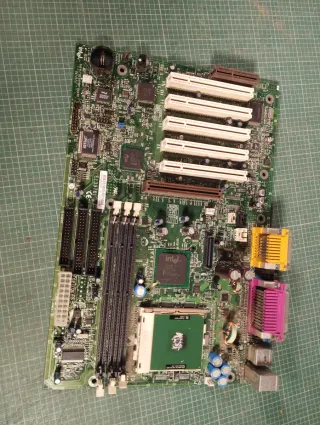 Placa base Intel con procesador Pentium III. - Socket 370. - Ranuras AGP y PCI. - Soporte para memoria RAM. - Conectores IDE y SATA.