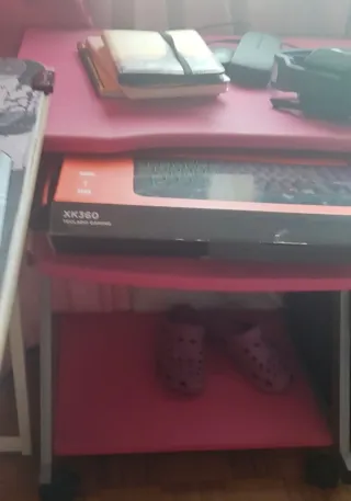 Mesa auxiliar de color rosa, ideal para colocar el ordenador o como superficie de apoyo. - Diseño moderno y funcional. - Estructura resistente. Está ya desmontada para llevar