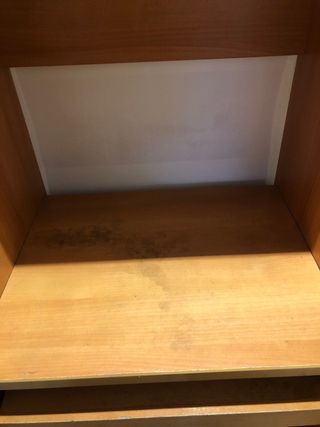 Mesa de ordenador con un diseño funcional y práctico. - Estructura de madera. - Cuenta con varios estantes para almacenamiento. - Incluye un cajón. - Base con ruedas para facilitar su movilidad. Tiene manchas como se ve en las fotos, son de tinte.