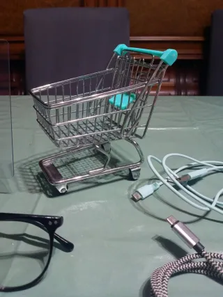 Conjunto de accesorios variados para móvil u ordenador. - Mini carrito de la compra para sujetar el móvil. - Gafas de montura negra. - Micrófono azul con cable. - Dos cables de carga (uno azul y otro trenzado). - Soporte negro amplificador de pantalla del móvil (tiene algún signo de uso) - protector de cable de carga.
