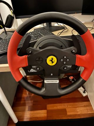 Volante de carreras Thrustmaster T150 con edición especial Ferrari. - Esta como nuevo, apenas tiene uso. - Empuñaduras recubiertas de goma roja. - Botones y levas de cambio integrados. - incluye pedalera con acelerador y freno.