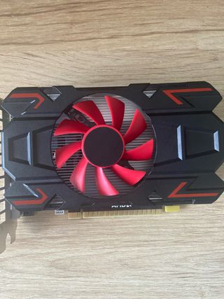 Tarjeta gráfica AMD HD7670 con ventilador. - Diseño en negro y rojo. - Ventilador central de aspas rojas.
