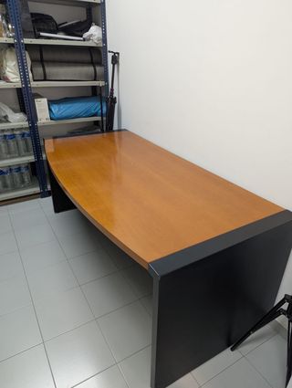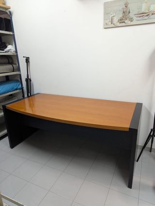 Vendo esta mesa ejecutiva de madera y estructura metálica en color negro, perfecta para despachos, clínicas, oficinas o espacios de trabajo donde se necesite solidez, presencia y mucho espacio útil. 🔹 Tablero amplio en acabado madera (gran superficie para ordenador, documentos y equipo). 🔹 Estructura metálica muy resistente, diseñada para durar años. 🔹 Panel frontal perforado para mayor privacidad y estética profesional. 🔹 Diseño curvo en el frontal que aporta ergonomía y un toque moderno. La mesa está en buen estado general, con el uso lógico del tiempo en la superficie, pero totalmente funcional, estable y lista para usar.