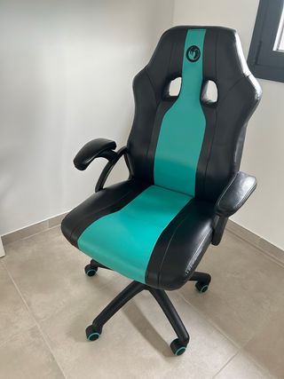 Silla de estilo gamer con un diseño moderno en negro y detalles en color turquesa. - Asiento y respaldo ergonómicos. - Base con ruedas para fácil movilidad. - Acabado en polipiel.