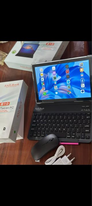 Tablet SAILBook B10 en color negro, ideal para uso diario. Incluye teclado y ratón. - Pantalla de 10.1 pulgadas. - Conectividad Wi-Fi. - Sistema operativo Android. - Incluye cargador y cable USB.
