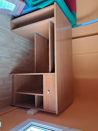 Mesa de madera ideal para estudio u oficina en casa. Cuenta con varios compartimentos para organizar tus pertenencias. - Diseño funcional. - Acabado en tonos madera y naranja. Medidas: Largo 120 cm Fondo 60 cm Alto 75 cm. Tiene 4 espacios en un lateral para dejar pequeños objetos. Bandejas extraible para teclado e impresora. Cajón. Varios espacios para guardar material diverso.