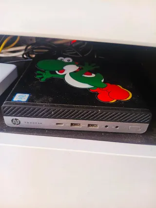 Mini ordenador HP ProDesk con procesador Intel Core i5. Diseño compacto y elegante. - Carcasa de color negro. - Incluye pegatinas decorativas de Yoshi. - juegos retro configurada con juegos de guerra mayormente