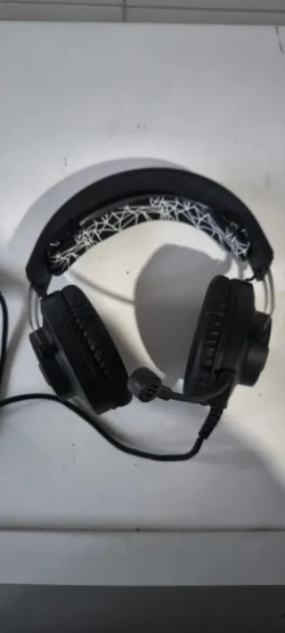 Auriculares gaming negros con diadema ajustable y micrófono integrado. - Diseño moderno con patrón geométrico en la diadema. - Almohadillas acolchadas para mayor comodidad, sin desgaste. - Micrófono flexible y direccional. Casi sin uso. El conector USB hace que los auriculares se iluminen. Si no se conectan funcionan igual, pero queda más chulo